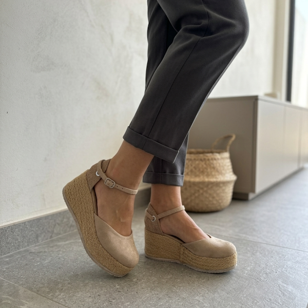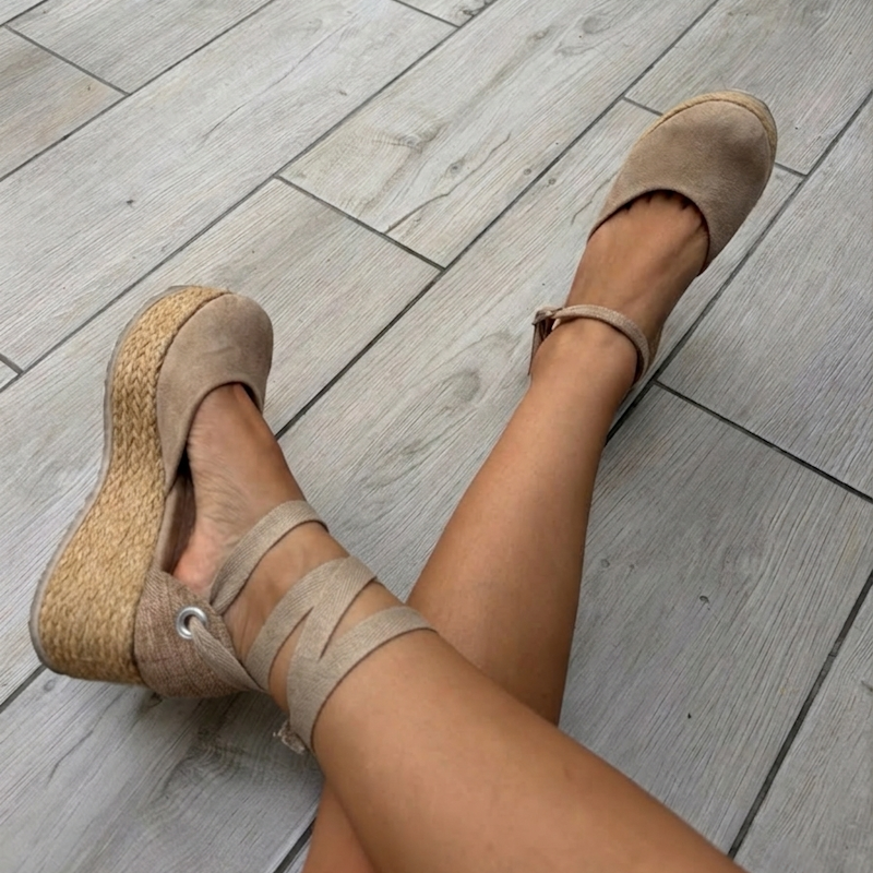 Alpargatas Lía en nuevo tono beige,con cintas al mismo color para un acabado más limpio y elegante. Puedes usarlas con o sin tiras, adaptándose a tu estilo en cada ocasión.