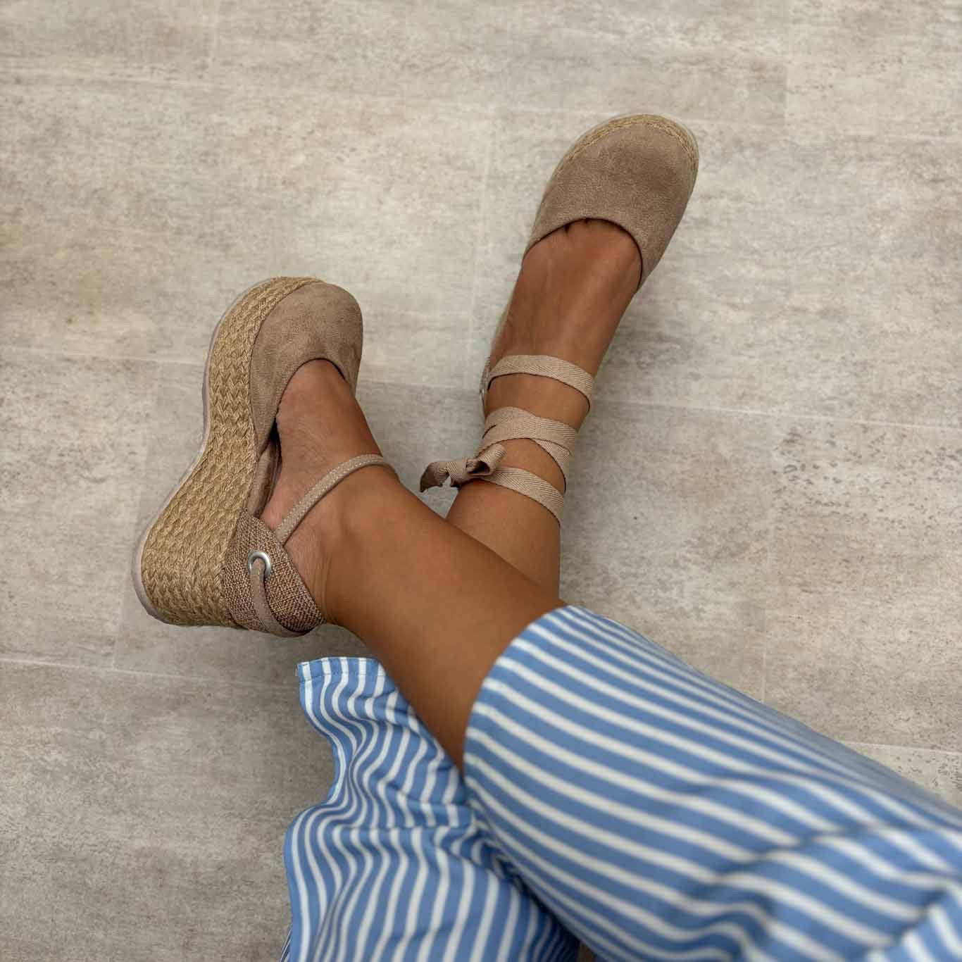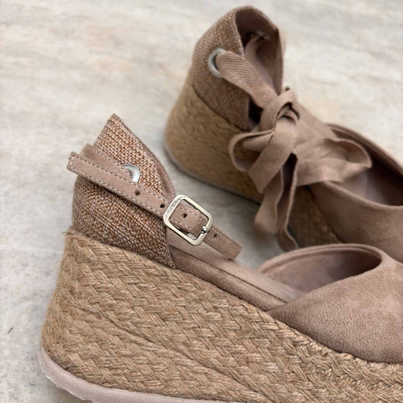 Alpargatas Lía en nuevo tono beige,con cintas al mismo color para un acabado más limpio y elegante. Puedes usarlas con o sin tiras, adaptándose a tu estilo en cada ocasión.